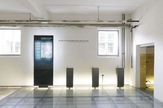 In der Rauminstallation im Untergeschoss kommen ehemalige Häftlinge des Konzentrationslagers Flossenbürg zu Wort. Die Beschreibungen der Überlebenden geben nicht nur Einblicke in die unmenschlichen Bedingungen im Lager, sondern spiegeln auch wider, wie sie ihre Erfahrungen mehrere Jahrzehnte später erinnern.