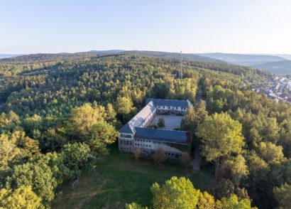 Letecký snímek někdejší důstojnické školy SS na Heidelsbergu v Aue, 2018 (KZ-Gedenkstätte Flossenbürg / Foto: Rainer Viertlböck). Budova po válce slouží jako základní škola. V roce 2019 je při požáru částečně zničena.