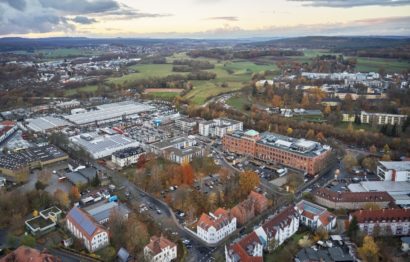 Letecký záběr někdejšího průmyslového areálu, Bayreuth 2018 (KZ-Gedenkstätte Flossenbürg / Foto: Rainer Viertlböck)