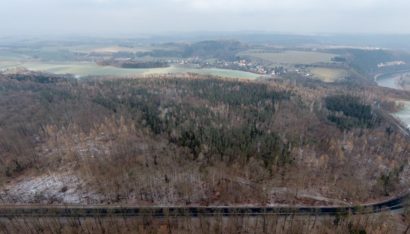 Druhý, větší vězeňský tábor museli vězni zřídit na druhé straně cesty v lese (Letecký snímek 2019: KZ-Gedenkstätte Flossenbürg / Foto: Rainer Viertlböck).
