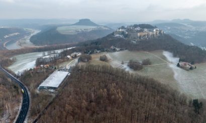 Letecký snímek zámku Königstein, 2019 (KZ-Gedenkstätte Flossenbürg / Foto: Rainer Viertlböck). První tábor vězňů se nacházel na místě parkovacího domu v popředí.