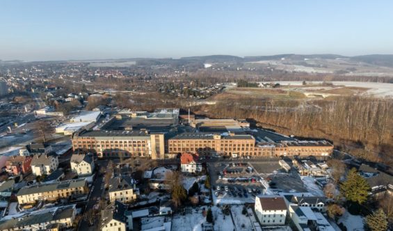 Luftbild des ehemaligen Fabrikgeländes in Flöha, 2019 (KZ-Gedenkstätte Flossenbürg / Foto: Rainer Viertlböck)