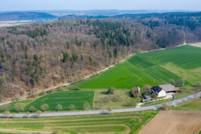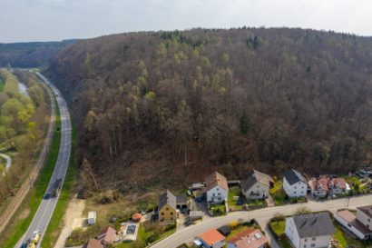 Luftaufnahme des Ringbergs in Saal a. d. Donau, 2019 (KZ-Gedenkstätte Flossenbürg / Foto: Rainer Viertlböck). Am Waldrand befanden sich die Stolleneingänge.