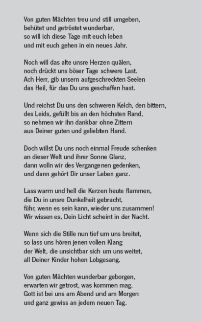 Diesem Brief fügt er das Gedicht »Von guten Mächten« hinzu. Der Text ist heute ein weit verbreitetes Kirchenlied, von dem über 35 Vertonungen vorliegen.