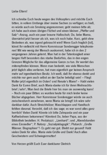Der letzte erhaltene Brief Bonhoeffers aus der Haft an seine Eltern vom 17. Januar 1945 (KZ-Gedenkstätte Flossenbürg)
