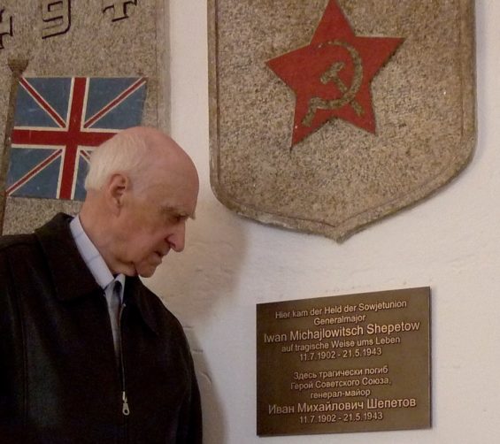 Jurij Iwanowytsch Schepetow vor der Gedenktafel für seinen Vater in der Kapelle „Jesus im Kerker“ in der KZ-Gedenkstätte Flossenbürg, 2010 (Privatbesitz)