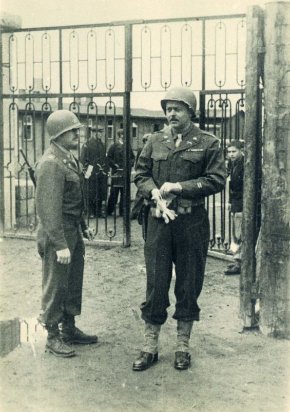 Jakub Szabmacher (rechts, hinter Major Gray, dem Leiter der amerikanischen Militärverwaltung in Flossenbürg) am Lagertor, Anfang Mai 1945 (Niederländisches Institut für Kriegsdokumentation, Amsterdam)