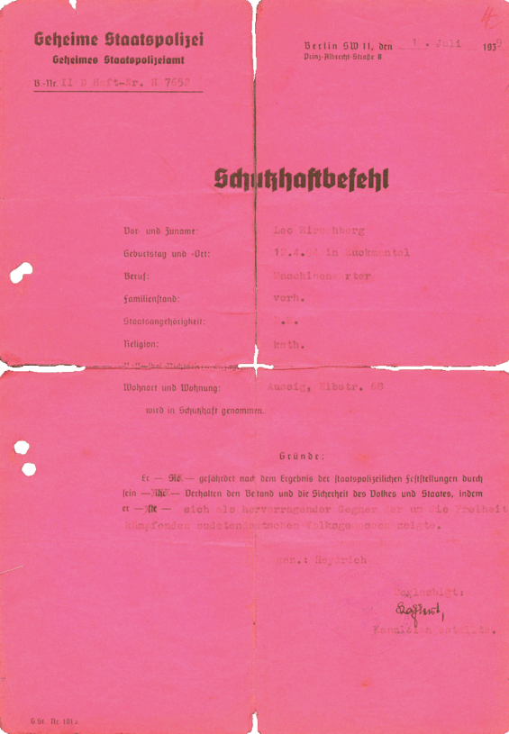 Während Leo Hirschberg im Gestapo-Gefängnis Aussig sitzt, erlässt das Reichssicherheitshauptamt gegen ihn einen Schutzhaftbefehl.
