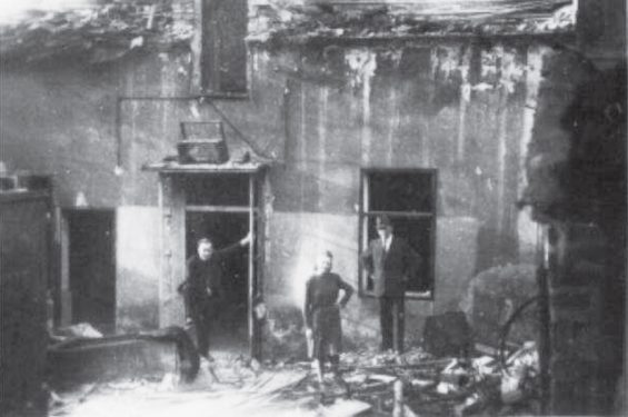 Leo Hirschberg (rechts) mit Verwandten vor dem zerbombten Haus der Familie, kurz nach dem Luftangriff auf Aussig am 19. April 1945 (Privatbesitz)