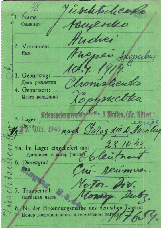 Andriy Andriyovych was captured by the Germans several days after the invasion of the Soviet Union. The lieutenant came from Khoruzhivka in the Ukraine. Like hundreds of thousands of Soviet prisoners of war, Yushchenko was transported from the front to the German interior. His path traversed multiple camps and work commandos: Mühlberg on the Elbe, Wolfen, Nuremberg, and finally Lamsdorf in Upper Silesia. In February 1944, the Wehrmacht “released” him from imprisonment due to his political activity and transferred him to the Auschwitz-Birkenau concentration camp.