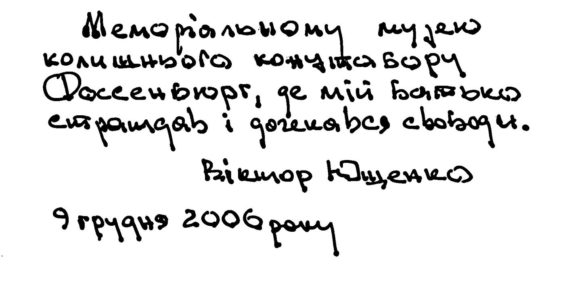 Dedicated to the concentration camp memorial of Flossenbürg, where my father suffered and regained his freedom. Viktor Yushchenko, September 9, 2006