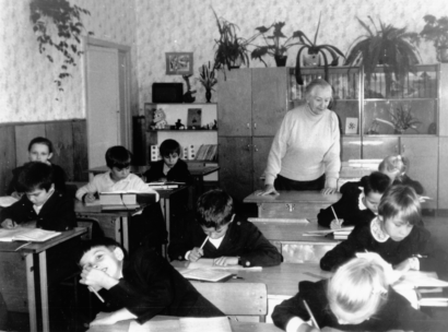 Lyubov Yakovlevna Karpovich with some schoolchildren, Minsk 1989 (private collection)