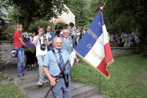 Roger Caillé as the flag bearer for the French prisoners’ organization “Association des Déportés et Familles des Disparus du Camp de Concentration de Flossenbürg et Commandos” at the memorial service at Flossenbürg, 2004 (Flossenbürg Concentration Camp Memorial)