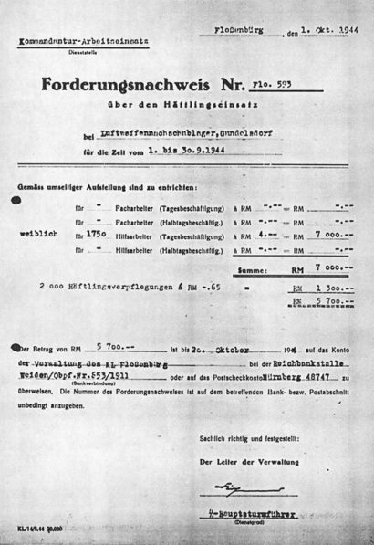 Payment claim issued by the Flossenbürg commandant’s office, 1944 (Bundesarchiv Berlin)