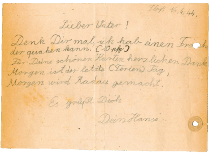Lettre de Hans Halboth avec un croquis du camp de concentration, 16 avril 1944