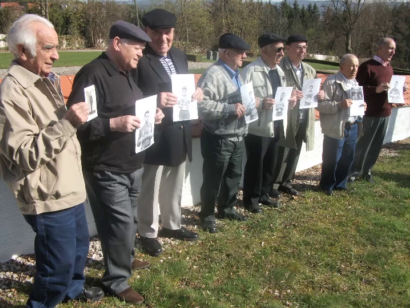 Les « Enfants d’Indersdorf » au Mémorial de Flossenbürg en 2008 : Mendel Tropper, Eric Hitter, Leslie Kleinman, Meir et Shmuel Reinstein, Dov Nasch, Avraham Leder et Martin Hecht tenant leur photographie de 1945