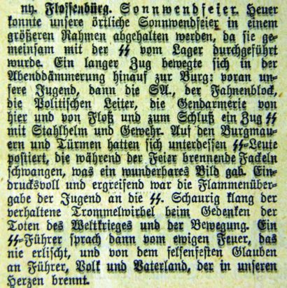 Le 23 juin 1938, le premier communiqué de presse faisant référence au camp de concentration de Flossenbürg est publié. Dans une courte note, l’auteur rapporte que les SS du camp ont participé à la fête du solstice à Flossenbürg
